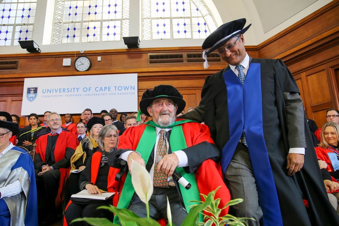 Denis receiving his honorary degree at the University of Cape Town with Royston Pillay, the Registrar of UCT.